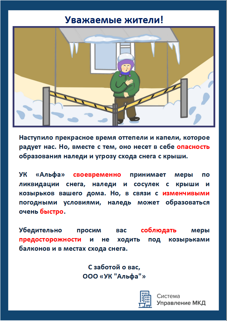 Сезонные объявления об опасности схода снега и льда с кровли МКД