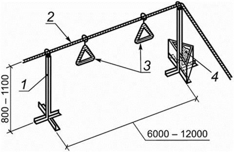 Сигнальное ограждение устанавливают как по плитам перекрытия, так и на земле. В качестве заполнения применяют канаты из синтетических ниток диаметром 8–12 мм или сигнальные ленты, прикрепляемые к стойкам или элементам здания.