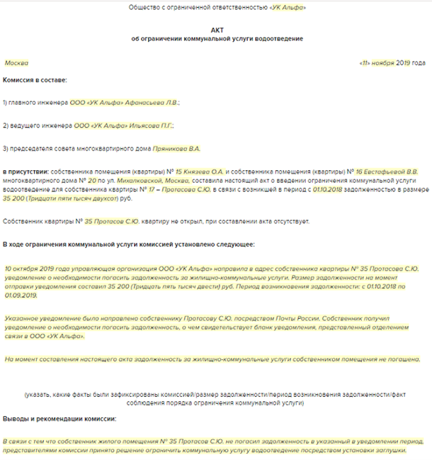 После того, как установили заглушки на ХВС или ввели другой способ ограничения, составьте акт об ограничении предоставления КУ на месте или в офисе. В акте укажите: с какого числа начнется приостановление предоставления КУ и показания прибора ИПУ перед приостановлением КУ.