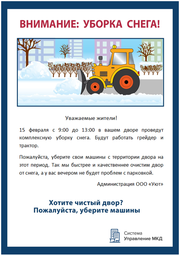 Если планирует комплексную уборку придомовой территории от снега и льда, предупредите жителей заранее. Попросите их освободить территорию от автомобилей. Объявления об уборке снега разместите на досках объявлений в подъездах МКД.