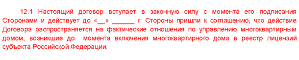 Измените условие о начале действия договора. Положение о том, что договор начинает действовать через 30 дней с момента его подписания, уже не работает. Также вы не вправе самостоятельно определить дату начала действия договора, тем самым продлить обязанность к управлению МКД.