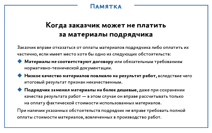Первое, что позволяет заказчику не платить за материалы подрядчика: некачественное выполнение работ. В этом случае считается, что подрядчик свою обязанность не выполнил, а потому заказчик не обязан платить ни за сами работы, ни за материалы, которые подрядчик использовал при их выполнении. При этом не имеет значения, по какой причине результат оказался плохим — из-за ошибок в работе подрядчика или из-за некачественных материалов.