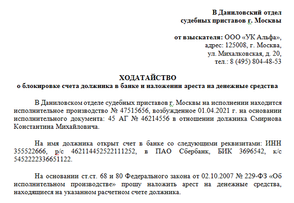 Рисунок 3. Образец ходатайства приставу о блокировке счета