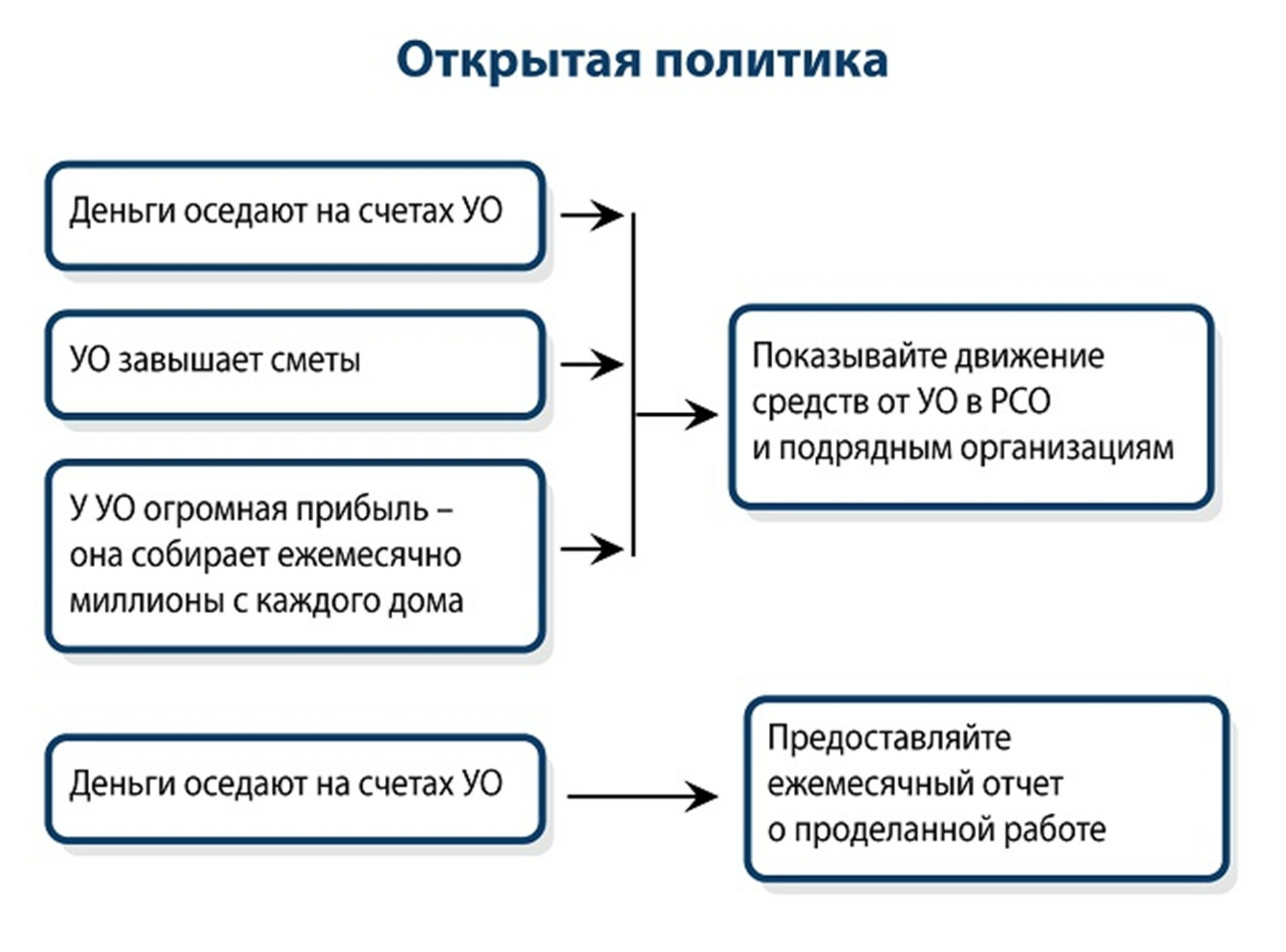 Используйте открытую политику, чтобы превратить УО в глазах жителей из тех, кто ежемесячно просто собирает деньги, в организацию, которая заботится об их благополучии.