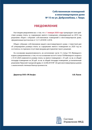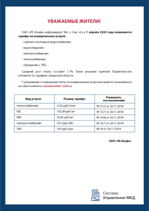 - объявления об изменении платы за жилищные услуги или тарифов за коммунальные услуги.