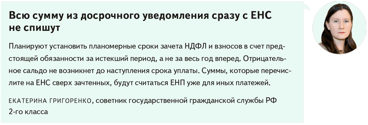 С 2026 года можно будет подавать уведомление по НДФЛ и взносам на будущие месяцы или даже на весь год сразу (ст. 58 НК в ред. законопроекта № 1026190-8). Платить заранее всю сумму не потребуется. Но порядок зачета скорректируют. Деньги по досрочным уведомлениям будут списывать с ЕНС по окончании каждого периода (ст. 11.3 НК в ред. проекта, см. комментарий ниже).